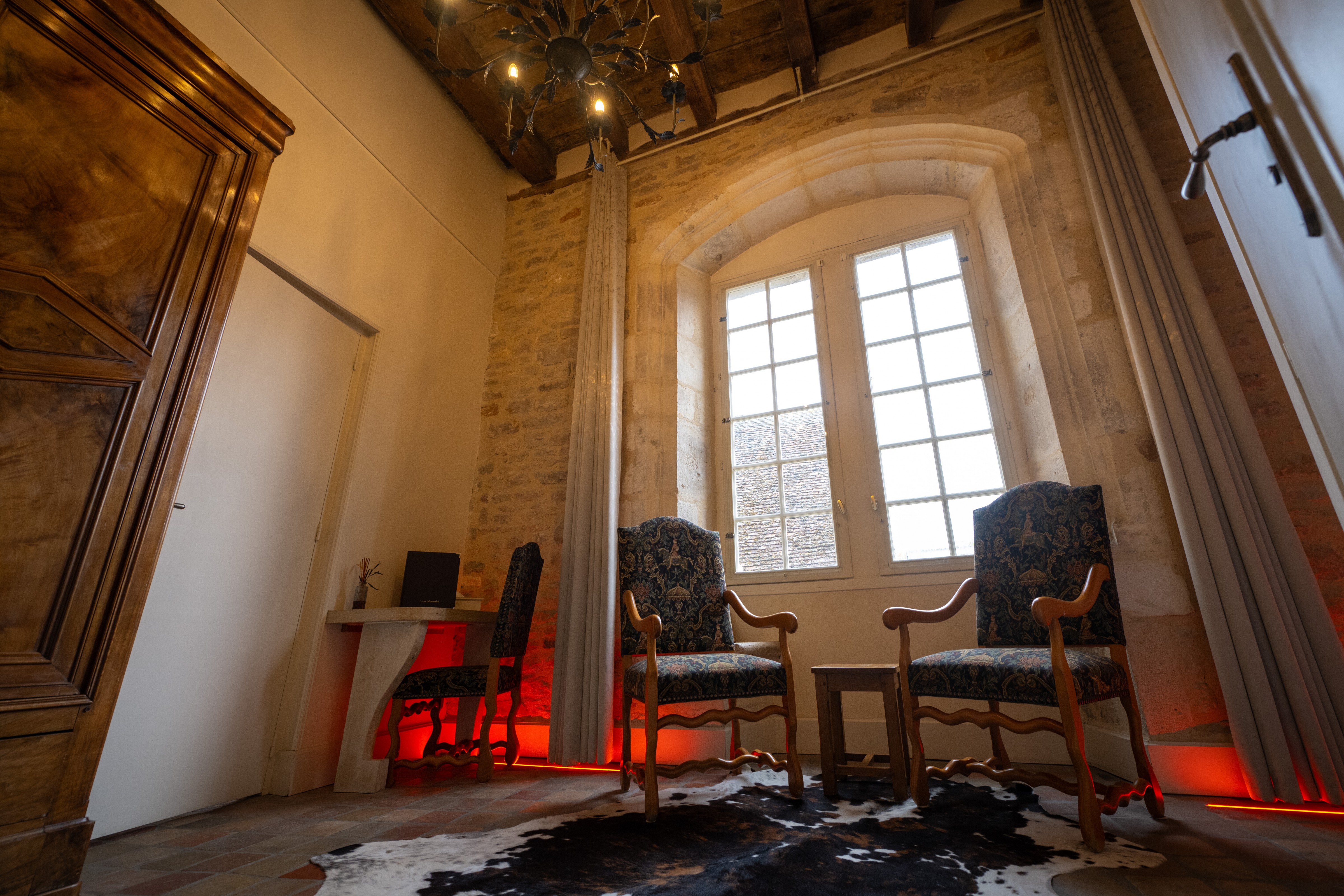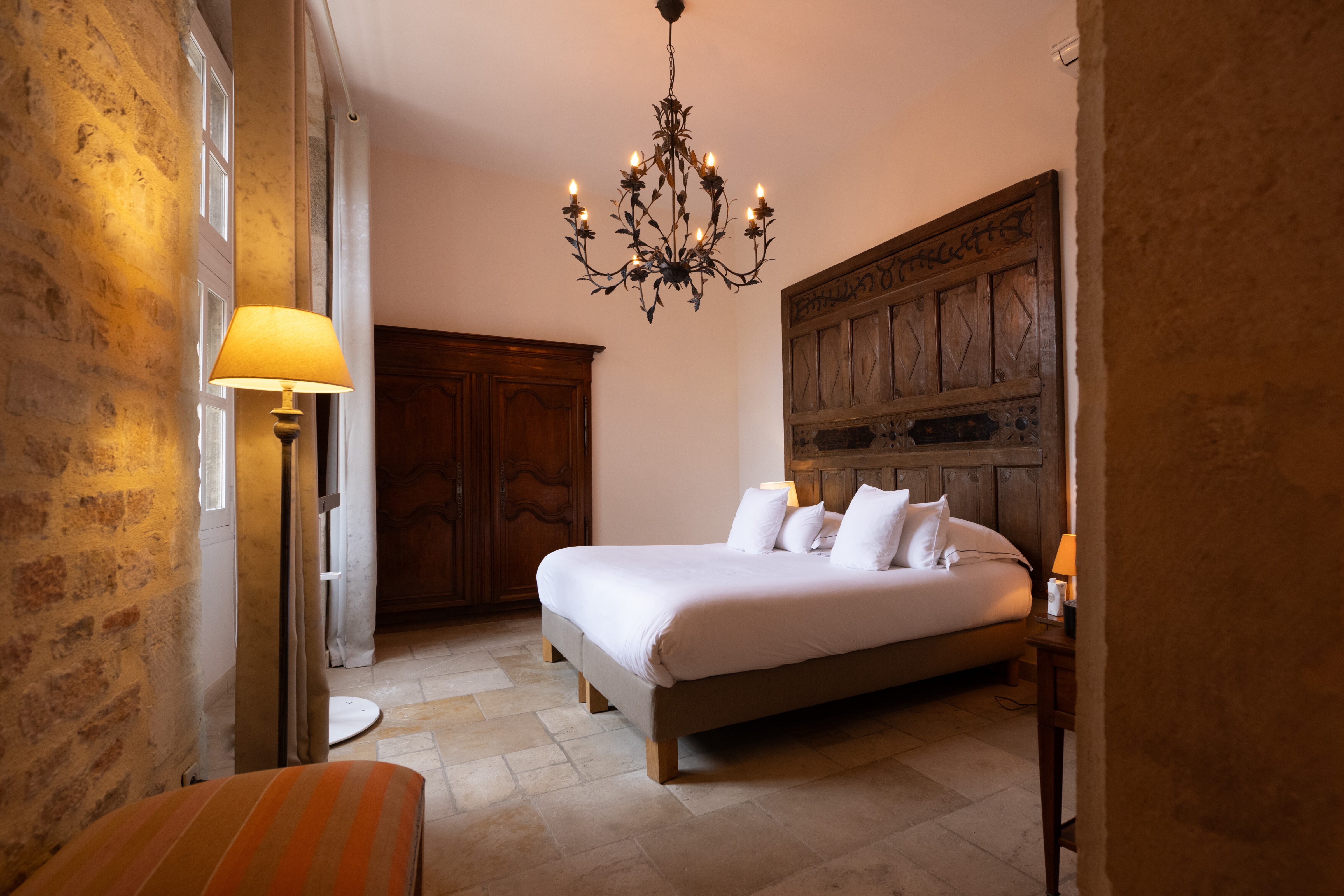 Сьют "Père Abbé", выходящий на улицу и расположенный на 2 этаже отеля, куда можно подняться по винтовой лестнице (лифта в отеле нет). Сьют состоит из спальни, выходящей на вход/малый холл, и гостиной, оборудованной диваном-кроватью, который по предварительной договоренности может быть трансформирован в две двухъярусные кровати (доплата 50 евро за каждого дополнительного жильца за ночь). Эти две комнаты разделены небольшой гостиной с каменными стенами и очень высокими потолками.