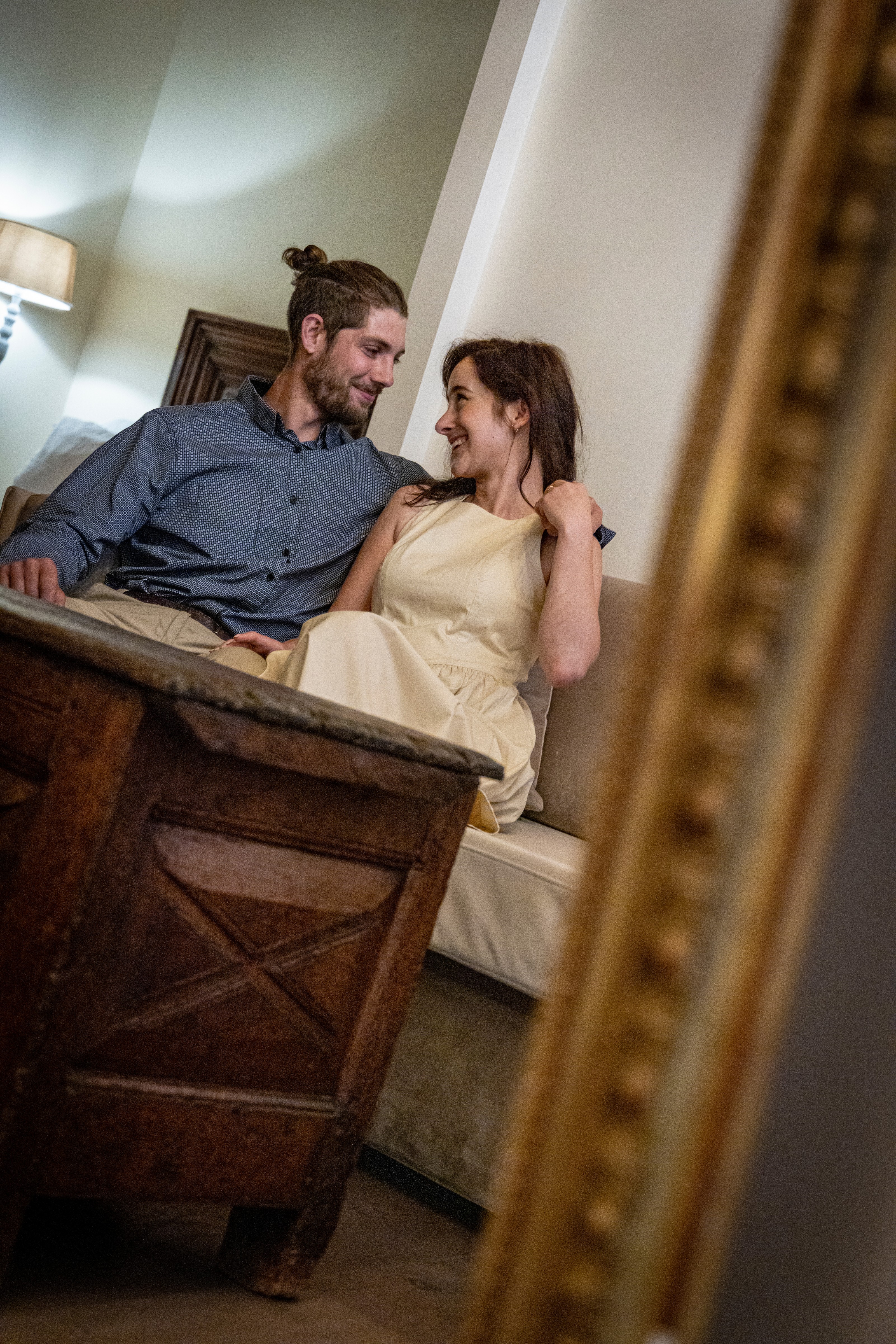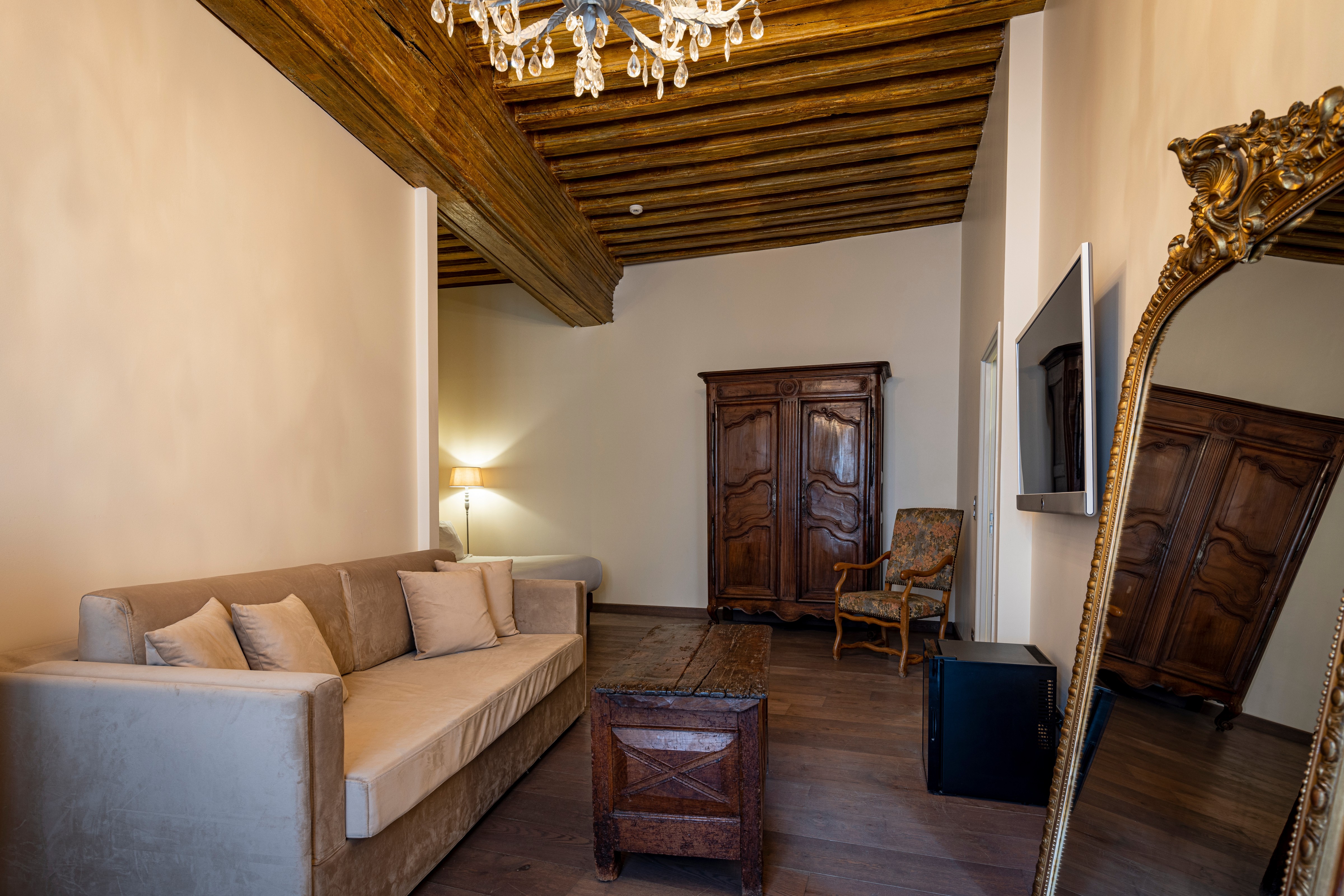Suite junior spacieuse pouvant accueillir jusqu\'à 4 personnes et située au 1er étage (accessible par l\'escalier en colimaçon).\nPlafond à la française et vue sur le Castrum Gallo-Romain du IIIème siècle.\nCoin séjour équipé d\'un canapé-lit modulable en deux lits superposés sur réservation préalable (supplément de 50€ par occupants supplémentaires et par nuit.\nSalle de bain avec douche à l\'italienne